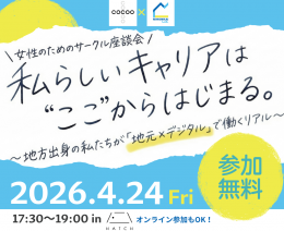 2026.04.01【コクー主催】2026/4/24(金)富山でキャリアイベントを開催!「地元×デジタル」で働く社員のリアルをお届けします「わたしらしいキャリアは”ここ”からはじまる。」~地方出身の私たちが「地元×デジタル」で働くリアル~ 「地元が好き。でも、このままでいいのかな?」 そんなモヤモ […]View More → -